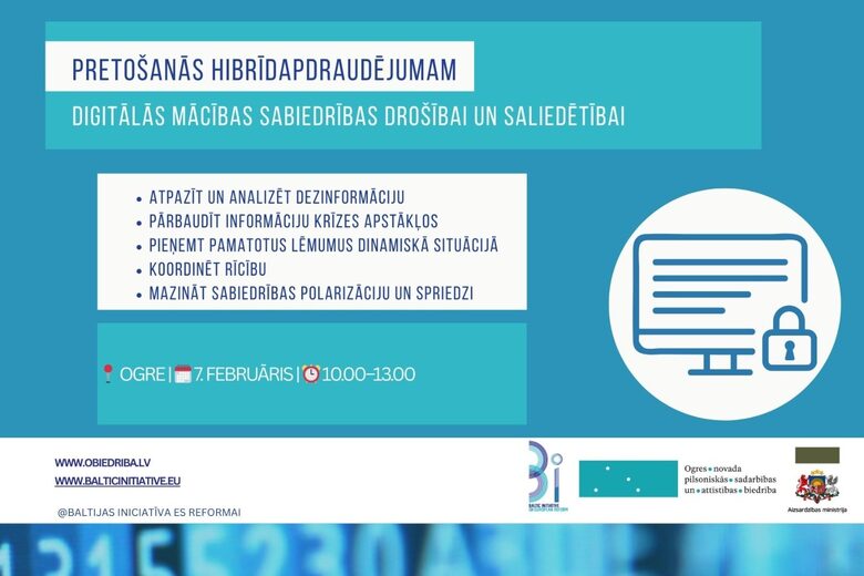 Biedrība “Ogres novada pilsoniskās sadarbības un attīstības biedrība” sadarbībā ar domnīcu “Baltijas iniciatīva ES reformai” un ar Aizsardzības ministrijas atbalstu Ogres iedzīvotājus un pilsoniskās sabiedrības pārstāvjus aicina piedalīties simulētās hibrīddraudu novēršanas mācībās, kas notiks 2026. gada 7. februārī Ogrē.
